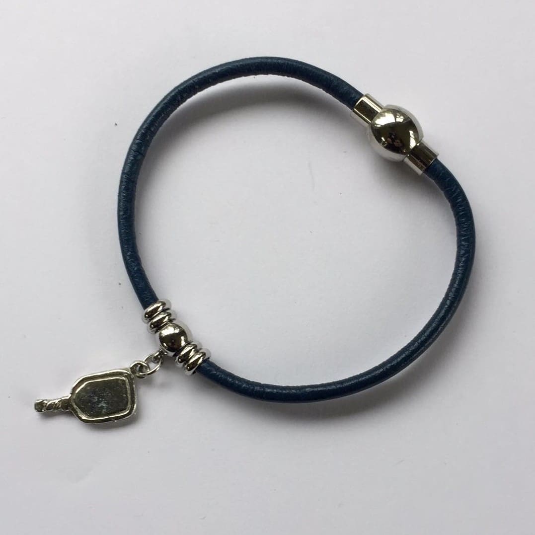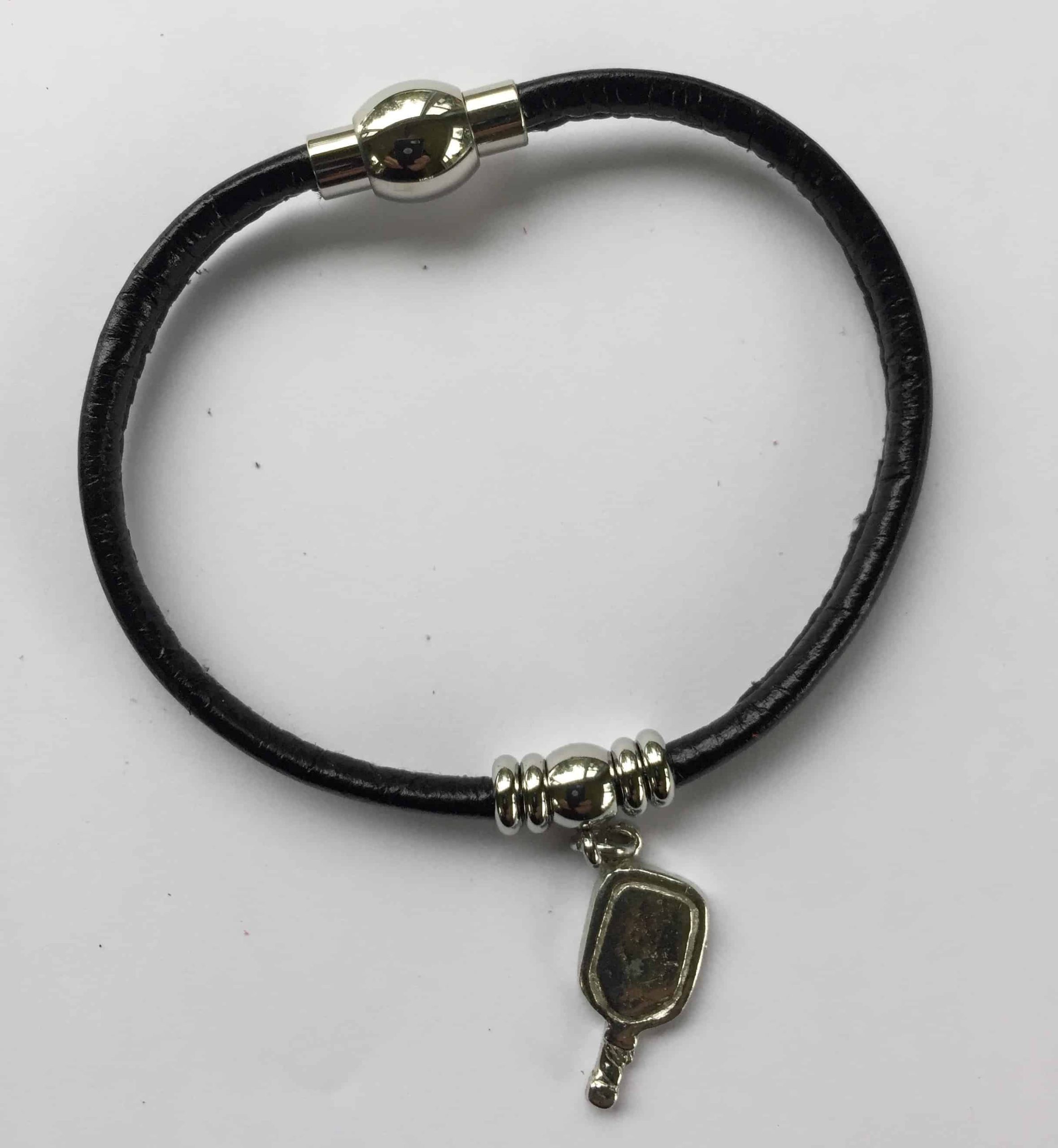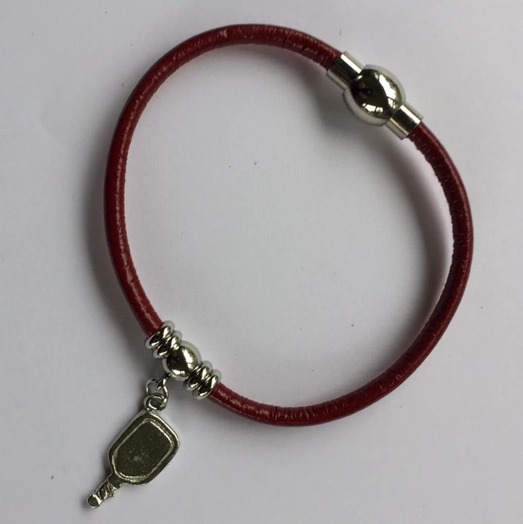 Leather pickleball bracelet (multiple colors) with a pickleball paddle pendant. A unisex, sporty, and trendy accessory for those passionate about the game.