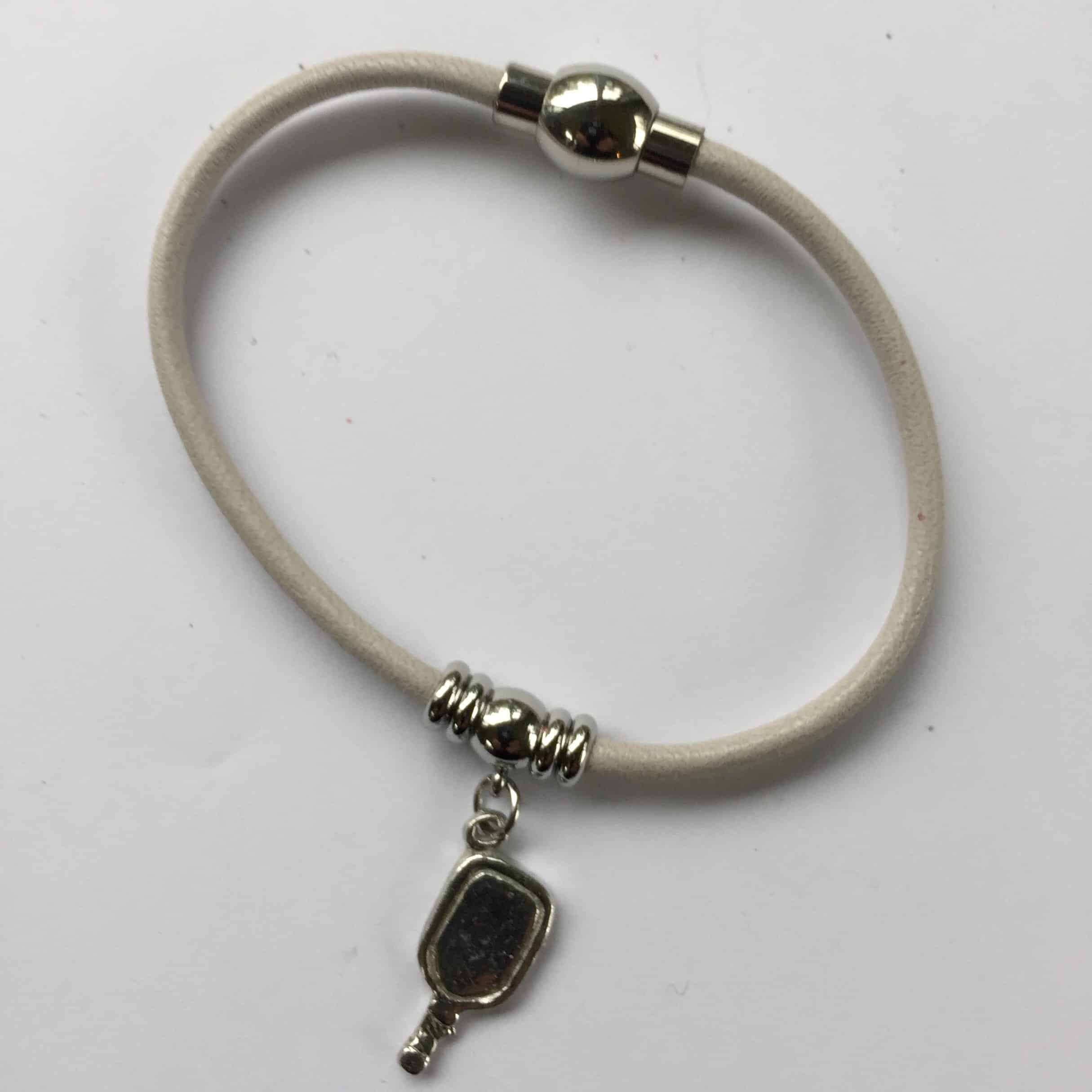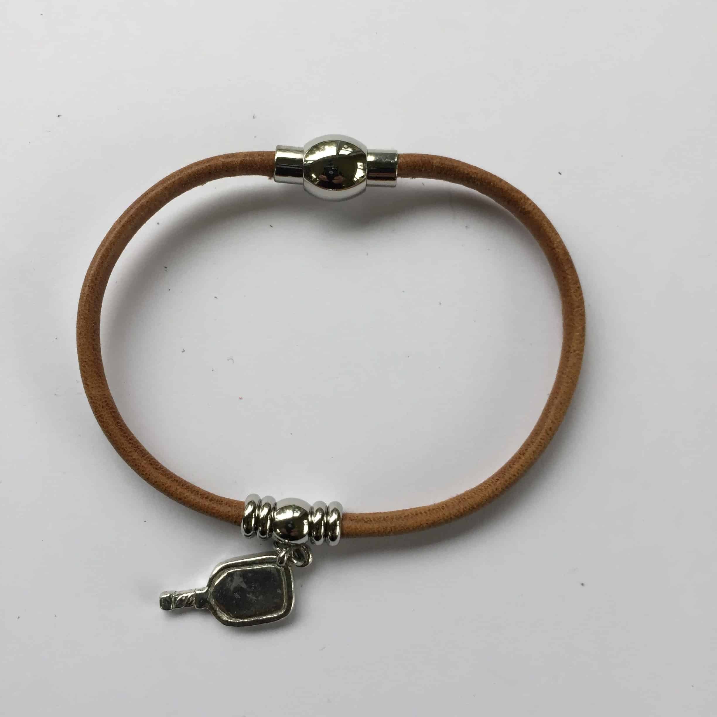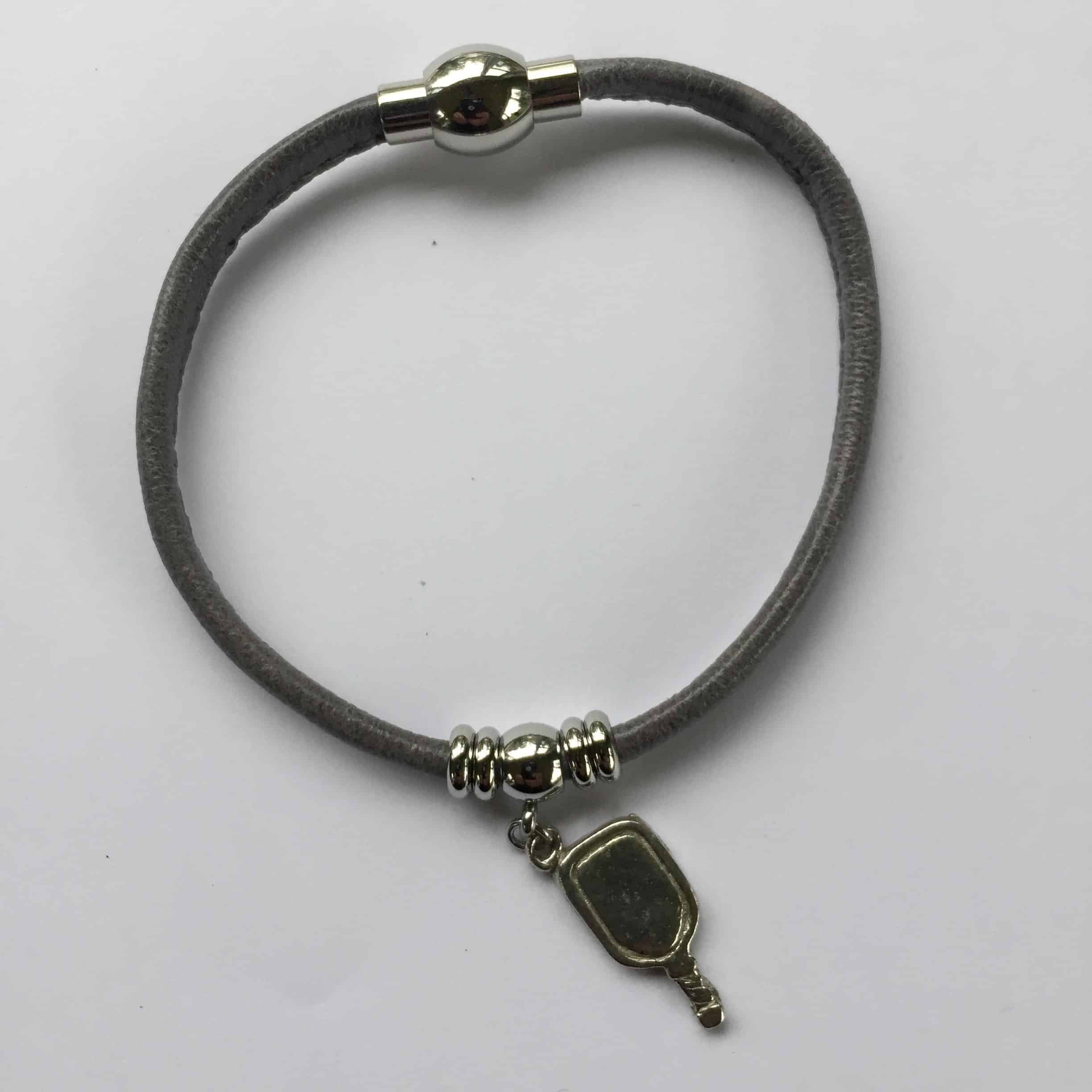 Leather pickleball bracelet (multiple colors) with a pickleball paddle pendant. A unisex, sporty, and trendy accessory for those passionate about the game.