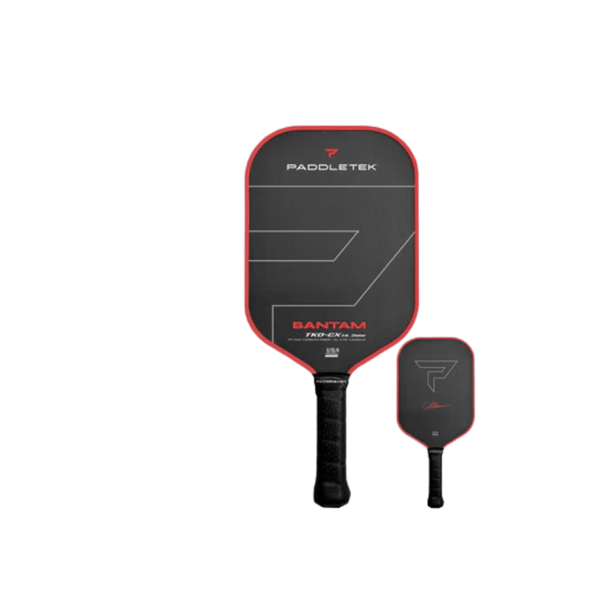 The Paddletek Bantam TKO-CX pickleball paddle (XL handle) was designed in conjunction with top pickleball pro, Christian Alshon, to provide a combination of power, spin, and reach. PT-700 unidirectional RAW carbon fiber is combined with our legendary 14.3 mm Bantam core to give serious players max power and spin capability. A 5 3⁄4” handle reduces wind drag and allows for a two-handed backhand, while a 16 1⁄2 ” overall paddle length increases speed at the point of contact—exponentially increasing power with every hit.