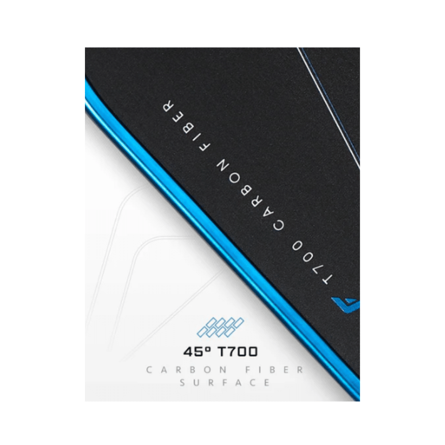 La fibre de carbone T700 est appliquée sous forme de couche de pelage à un angle de 45°. Le T700 crée une surface naturellement texturée et le fait de l’appliquer à un angle de 45° permet d’obtenir une texture réelle et cohérente sur toute la surface de la raquette de pickleball, ce qui maximise le potentiel de rotation.