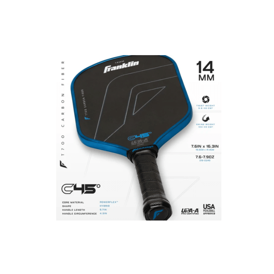 Franklin Sports continue de repousser les limites du pickleball compétitif avec l’introduction de la toute nouvelle raquette de pickleball Franklin C45° en fibre de carbone. La C45° est une raquette hybride qui intègre une multitude de technologies, offrant à chaque joueur un équilibre parfait entre contrôle ultime et puissance maximale sur le terrain.